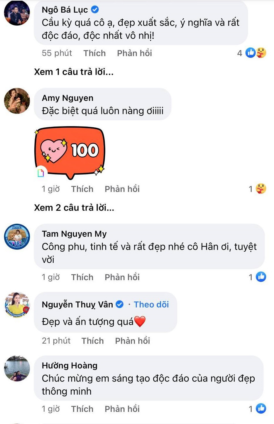 - Nét truyền thống của di sản văn hoá trên giấy dó nổi tiếng của Việt Nam. Hoa hậu thực sự rất tinh tế và thể hiện được nguồn gốc, giữ gìn bản sắc của người Việt. 100 điểm cho cô hoa hậu siêu dễ mến, tài năng.