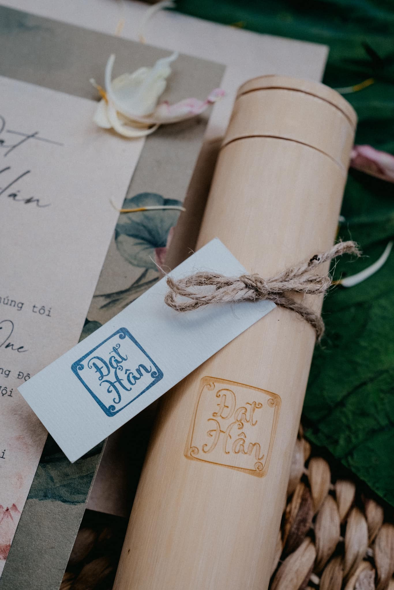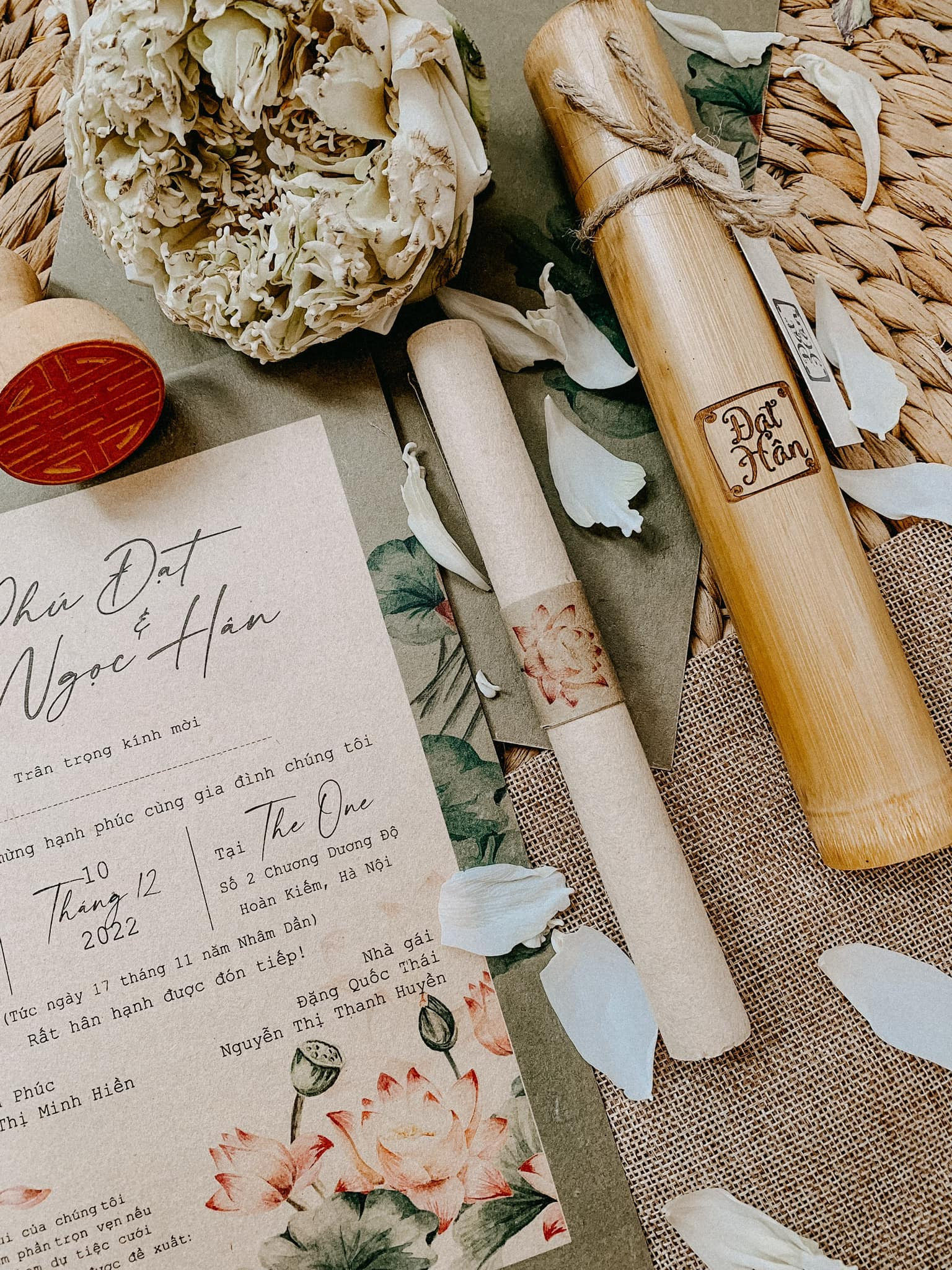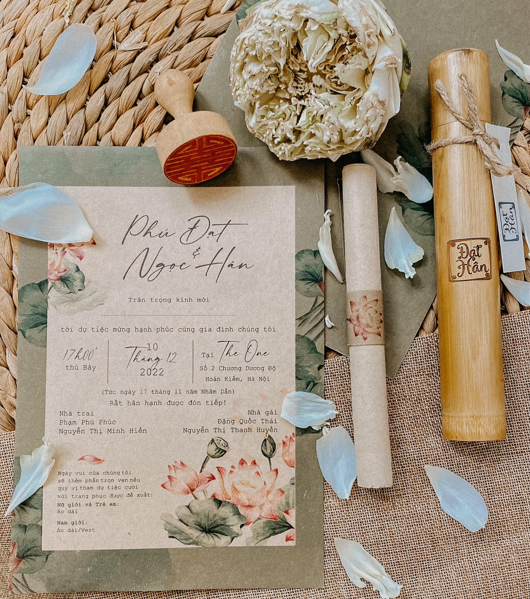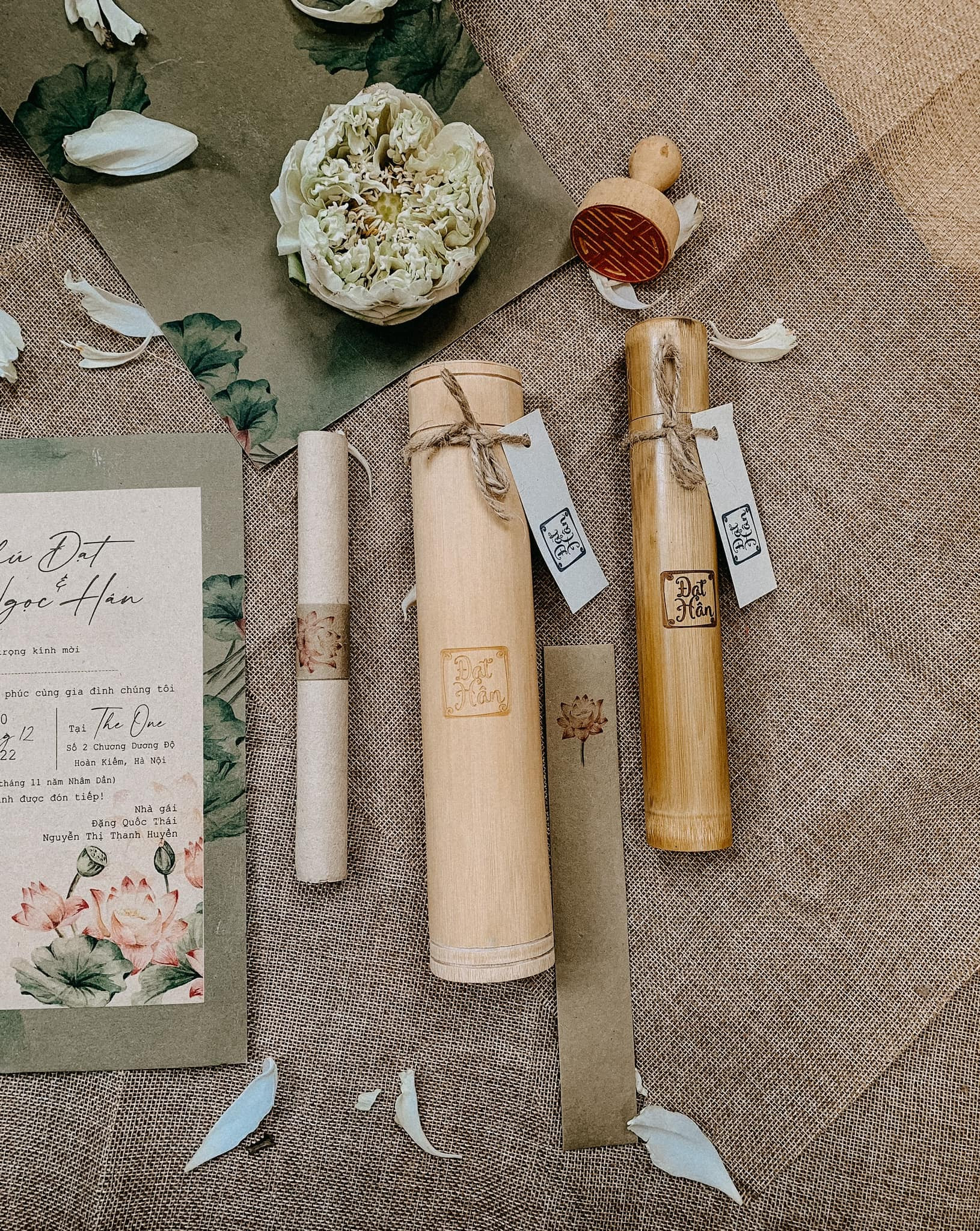 Không giống những thiệp cưới bình thường, thiệp mời của Ngọc Hân được thực hiện cầu kỳ, đậm bản sắc văn hóa truyền thống với những chất liệu độc đáo như ống tre, giấy dó. Trên ống tre còn tỉ mỉ khắc logo được cách điệu từ dấu triện.