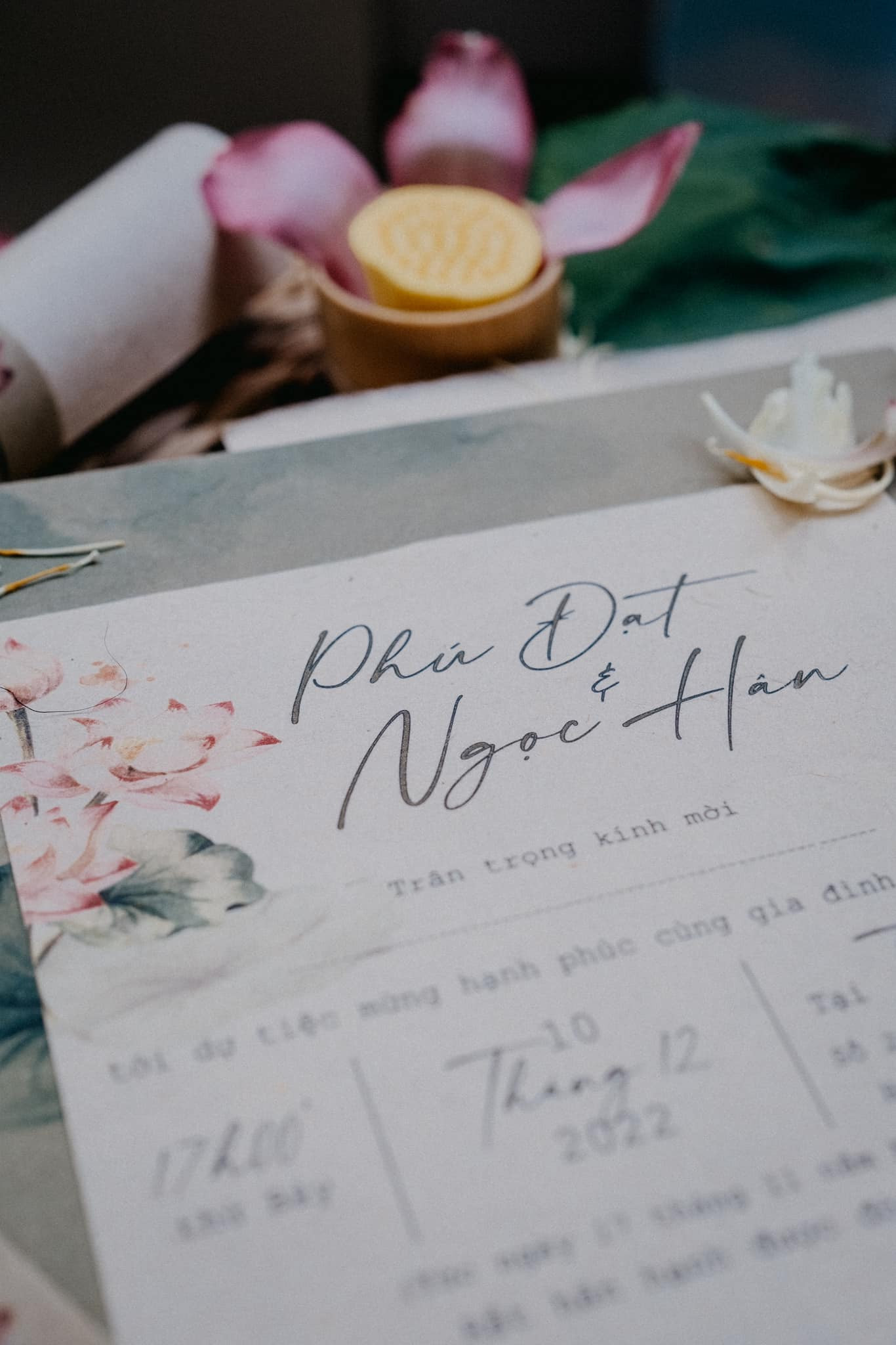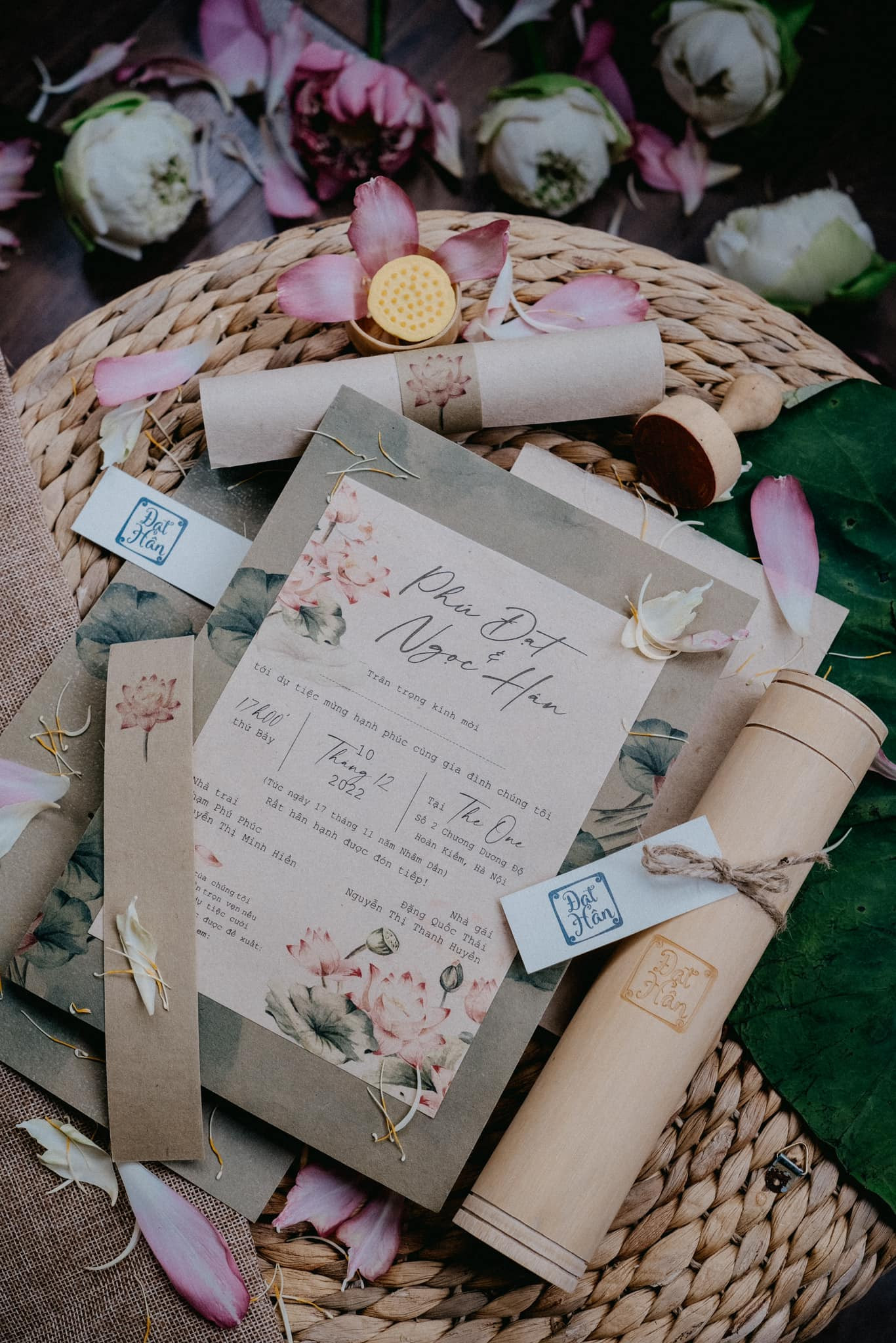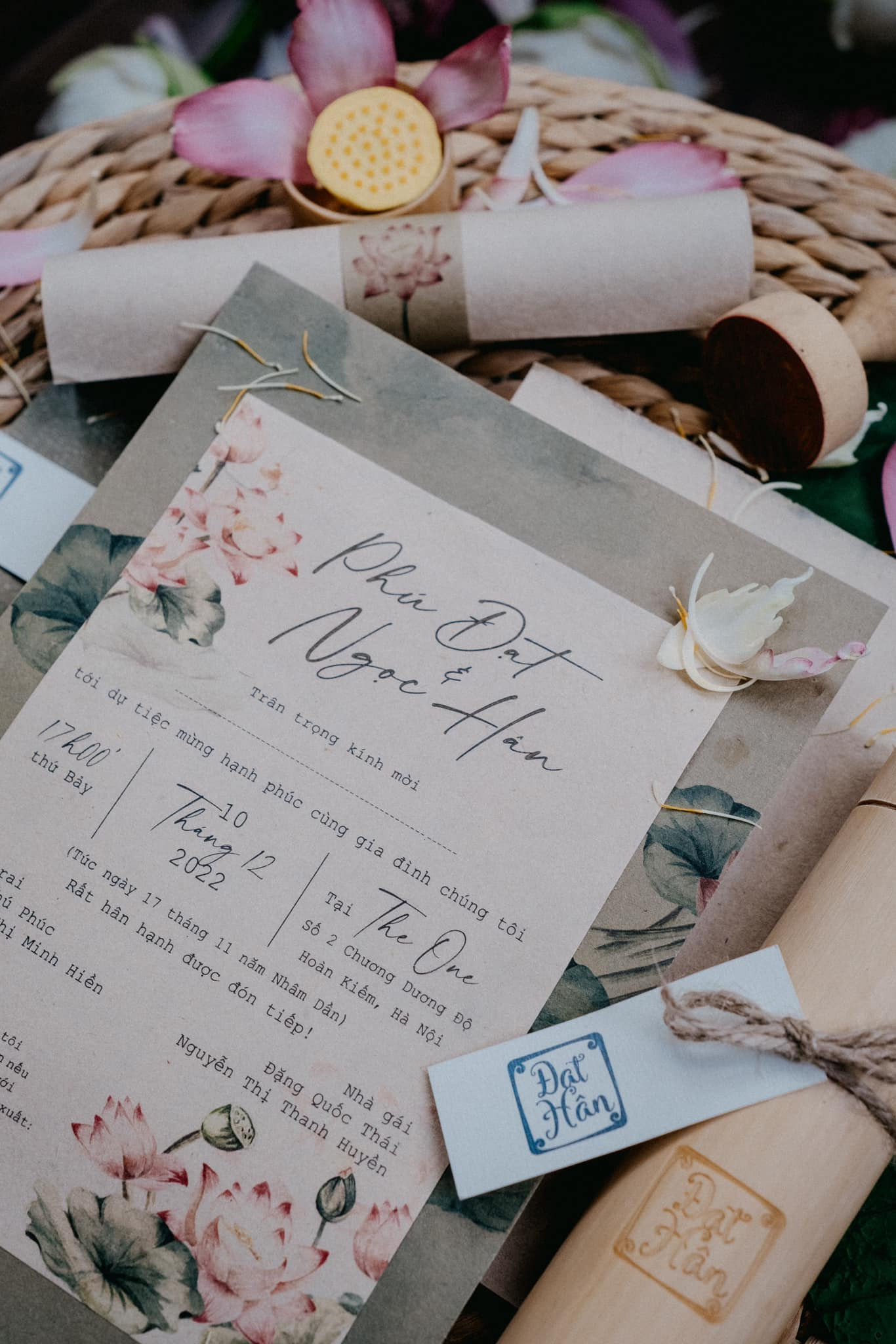 Đặc biệt hình ảnh hoa sen mà Hân vẫn hay thêu trên những tà áo dài… thì nay lại khoe sắc trên chính tấm thiệp cưới của mình”.