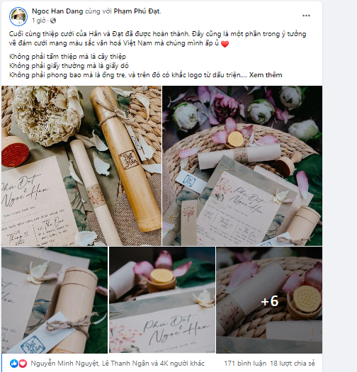 “Giấy dó, ống tre đều là những vật liệu thân thiện môi trường nên cũng là lý do được chúng tôi ưu ái lựa chọn. Sau khi nhận thiệp, mọi người có thể tiếp tục dùng ống tre để đựng trà hay cho trẻ nhỏ đựng kẹo cũng rất xinh. Như thế thì bộ thiệp của tôi lại càng được gắn bó dài dài với mọi người hơn", Ngọc Hân mong muốn.