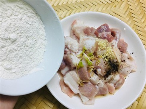 Bước 1: Thịt cắt miếng vừa ăn, rửa sạch, ướp với 1/2 muỗng đường, 1/2 muỗng nước mắm, tiêu và đầu ngò cắt nhuyễn. Cho bột vào thịt xóc đều.