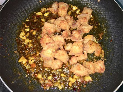 Bước 2: Đun dầu nóng, cho thịt vào chiên giòn với lửa vừa, thịt vàng giòn vớt ra để ráo dầu.