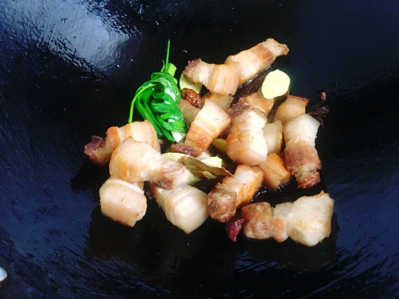 Để một ít dầu trong nồi, cho gừng thái chỉ, hành lá, hoa hồi, quế, lá nguyệt quế, thảo quả vào đảo, sau đó đổ thịt vào, đảo đều một lúc.