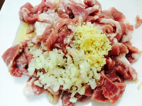 Bước 1: Thịt nạc vai sơ chế sạch thái miếng thật mỏng, bản dài. Hành khô, tỏi bóc vỏ băm nhỏ.