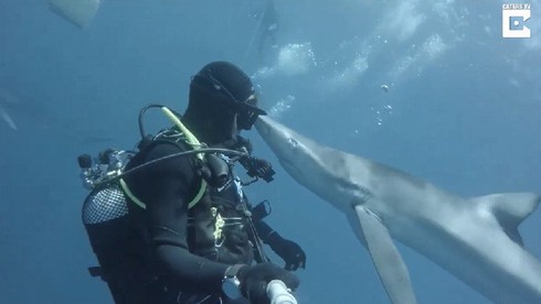 Thợ lặn giật nảy mình khi bị cá mập "hôn"