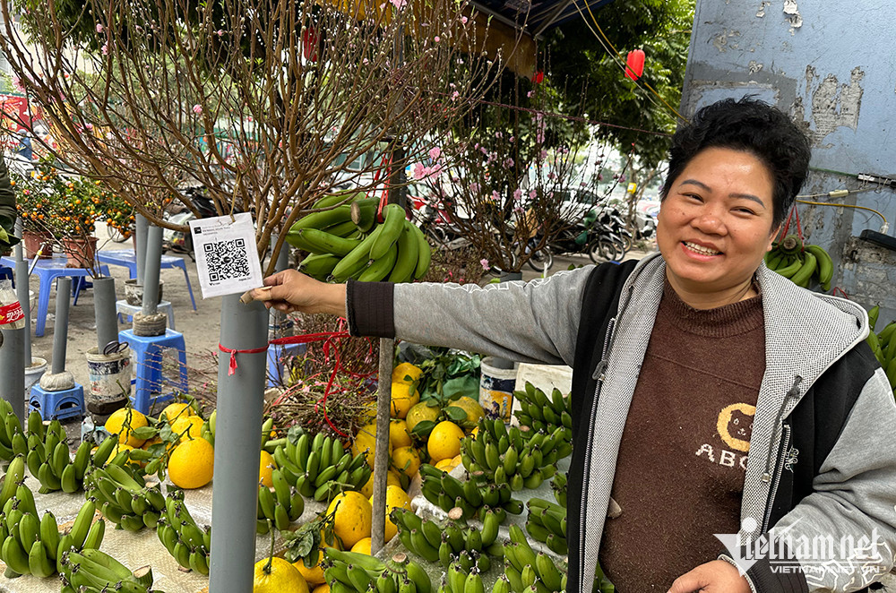 Chỉ “buôn thúng bán mẹt” ở chợ gần nhà, nhưng trên gánh hàng rau của chị Lê Thị Huyền Trang cũng treo lủng lẳng tờ giấy nhỏ in mã QR code đã được ép plastic.