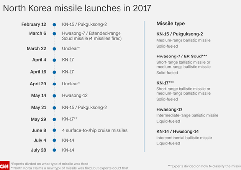 Những lần thử tên lửa của Triều Tiên từ đầu năm 2017 đến nay. Nguồn: CNN |