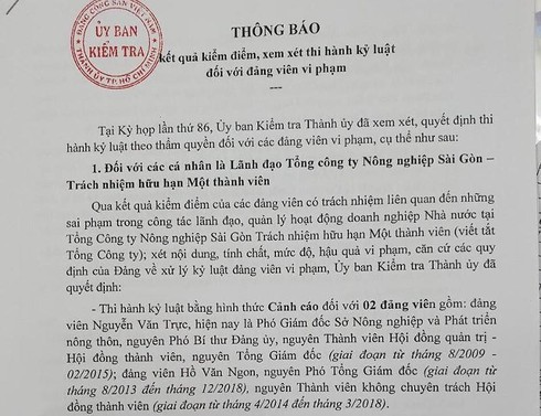 Cụ thể, Ủy ban kiểm tra quyết định kỷ luật cảnh cáo đối với ông Nguyễn Văn Trực, hiện là Phó Giám đốc Sở NN&PTNT, nguyên Phó Bí thư Đảng ủy, nguyên Thành viên Hội đồng quản trị - Hội đồng thành viên, nguyên Tổng Giám đốc (giai đoạn từ tháng 8/2009 đến tháng 2/2015).