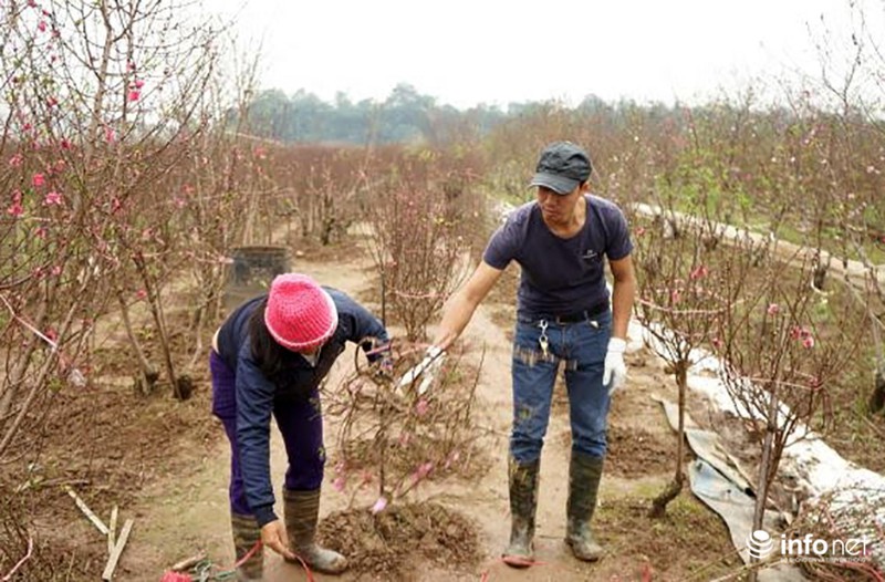 Do sợ đào nở sớm nên trước đó nhiều người đã tới đặt chủ vườn chăm sóc để đào nở đúng dịp Tết. |