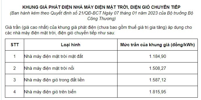 Hai bên đã họp và thống nhất giá mua điện tạm (chưa bao gồm thuế VAT) bằng 50% giá trần của khung giá phát điện cho từng loại hình nhà máy điện quy định tại Quyết định số 21/QĐ-BCT ngày 7/1/2023 của Bộ Công Thương. Giá mua điện chính thức và việc quyết toán tiền điện sẽ thực hiện theo hướng dẫn/quyết định của cấp có thẩm quyền.