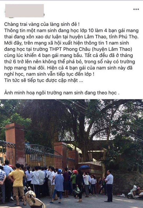 Cụ thể, theo nguồn tin lan truyền trên mạng xã hội, nam sinh lớp 10 đang học tại trường THPT Phong Châu (thị trấn Lâm Thao, Phú Thọ) có quan hệ yêu đương khiến 4 bạn gái mang thai.