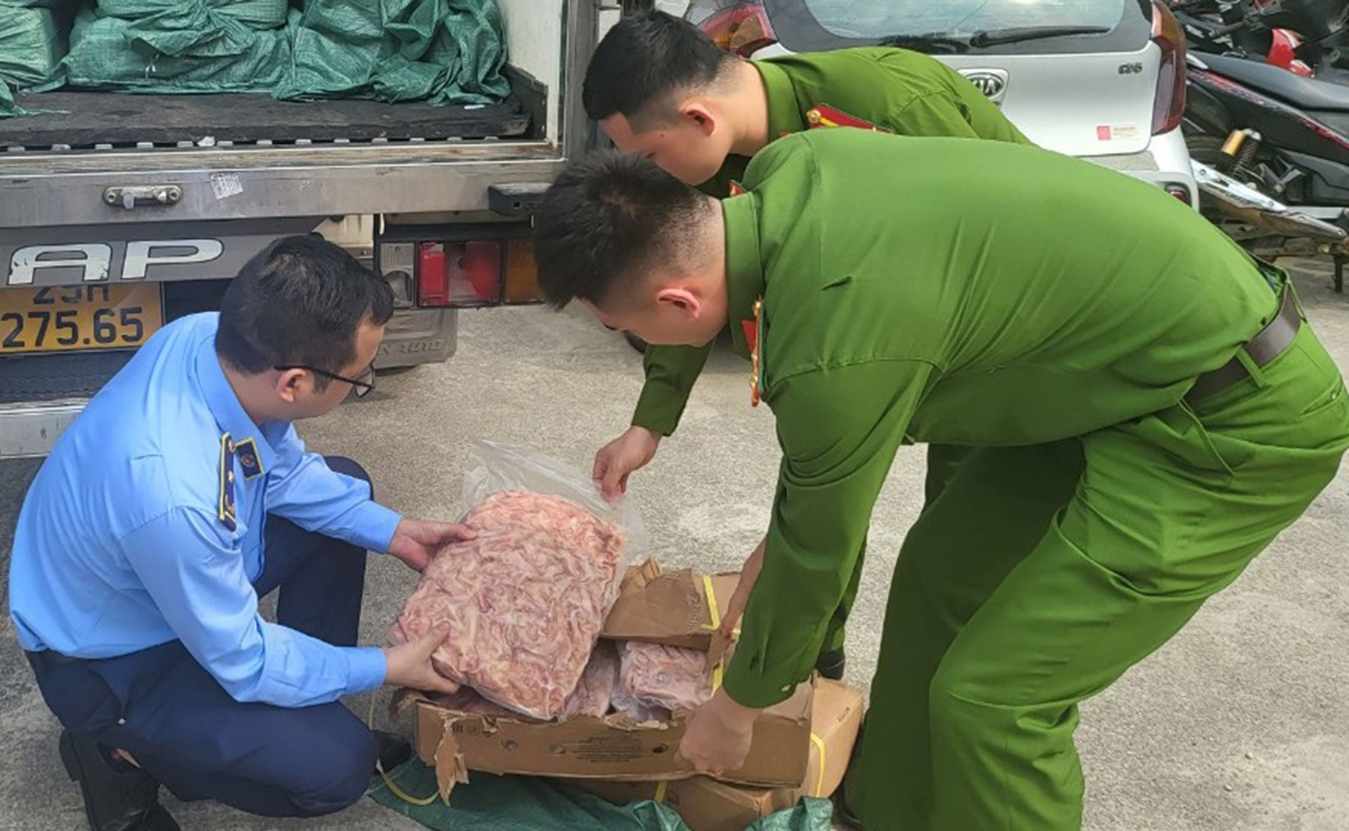 Đoàn kiểm tra phát hiện trên xe có vận chuyển hàng hóa là thực phẩm đông lạnh, trên bao bì hàng hóa không có tem nhãn, có dấu hiệu vi phạm về nhãn hàng hóa. Hàng hóa trên xe là chân gà rút xương đông lạnh được hút chân không đóng trong hộp cát tông, loại 20kg/hộp, số lượng 100 hộp, tổng trọng lượng 2 tấn.