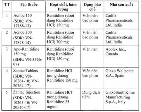 Phó Cục trưởng Cục Quản lý Dược Đỗ Văn Đông đã ký công văn số 16814/QLD-CL. Theo đó, 11 loại thuốc có chứa hoạt chất ranitidine trên bao gồm: 9 loại là viên nén bao phim, 1 loại tiêm, 1 siro. Tất cả các loại thuốc này đều là thuốc điều trị viêm loét dạ dày và ruột. Theo kiểm tra, các thuốc trên có xuất xứ từ Ấn Độ, Tây Ban Nha, Italy, Anh, Thái Lan, Malaysia.