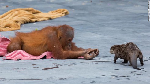 Đười ươi chơi đùa cùng rái cá trên bờ |