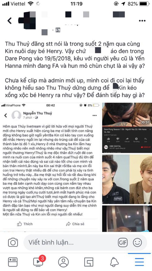 Đặc biệt, nhiều khán giả "soi" kĩ trong bài đăng của Thu Thủy, có đoạn nói Kin Nguyễn đã cùng mình nuôi dạy, chăm sóc cậu con trai Henry trong suốt 2 năm qua, nên nếu Kin Nguyễn đối xử không tốt với Henry, thì Thu Thủy cũng sẽ vì con, bảo vệ con đầu tiên.