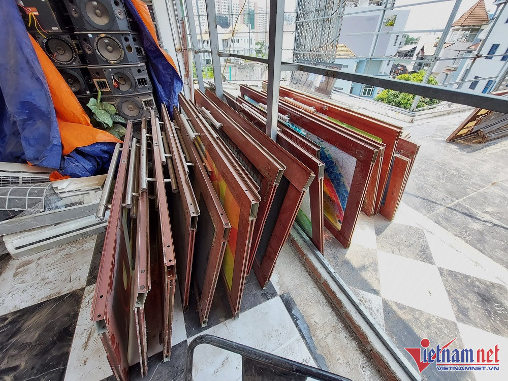 Toàn bộ cánh cửa tại một quán karaoke bị tháo bỏ, thay bằng cửa khó cháy. (Ảnh: Trần Chung)
