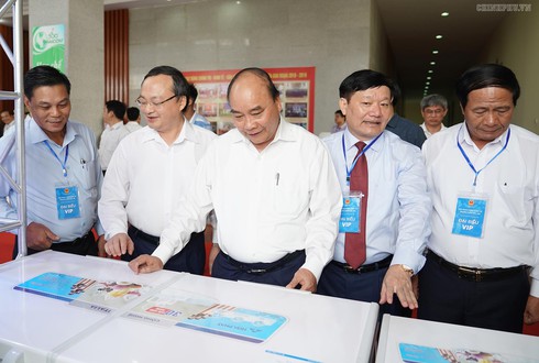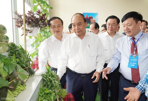 Thủ tướng và các đại biểu tham quan khu trưng bày các sản phẩm đặc trưng của khu vực Bắc Bộ. Ảnh VGP/Quang Hiếu |