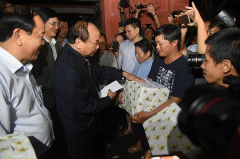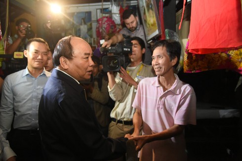 Thủ tướng Nguyễn Xuân Phúc trao quà, động viên người dân. Ảnh VGP/Quang Hiếu |