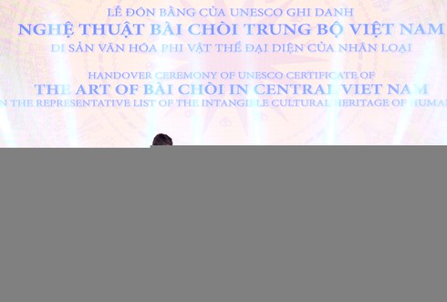 Tại buổi lễ, ông Michael Croft - Trưởng đại diện Văn phòng UNESCO tại Việt Nam đã trao bằng UNESCO ghi danh nghệ thuật bài chòi Trung Bộ Việt Nam là di sản văn hóa phi vật thể của nhân loại cho lãnh đạo Bộ VHTT&DL cùng 9 tỉnh, thành phố.