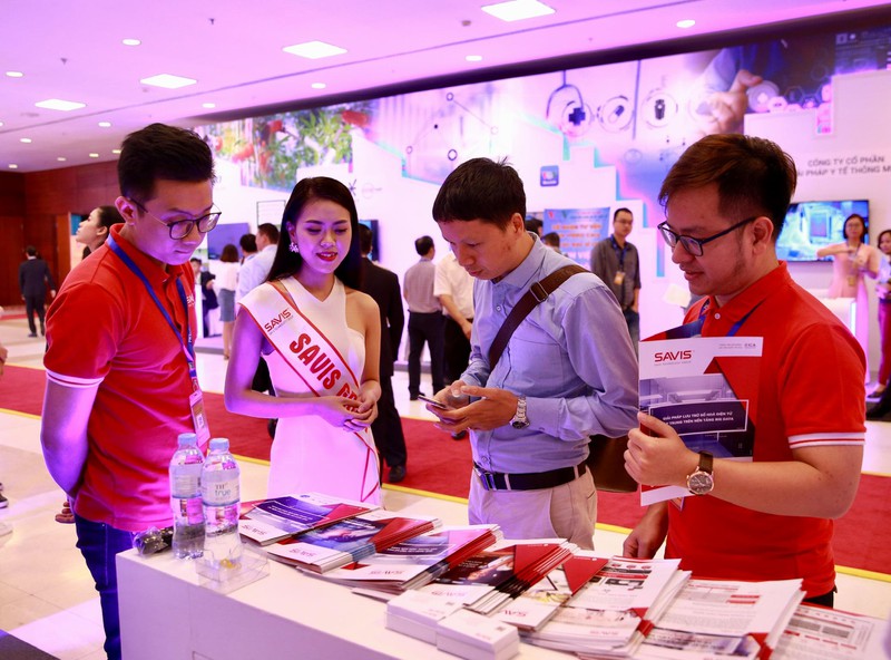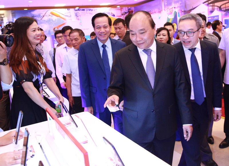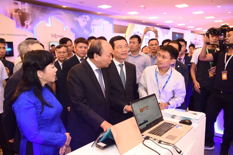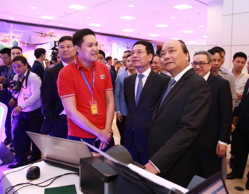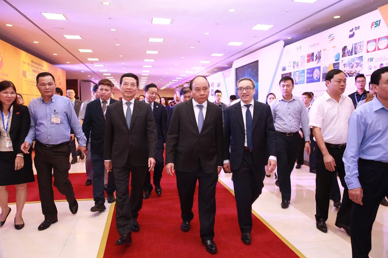 Thủ tướng Nguyễn Xuân Phúc cùng Bộ trưởng Bộ TT&TT Nguyễn Mạnh Hùng cùng các vị quan khách nghe các doanh nghiệp giới thiệu về công nghệ và các sản phẩm của công ty mình. |