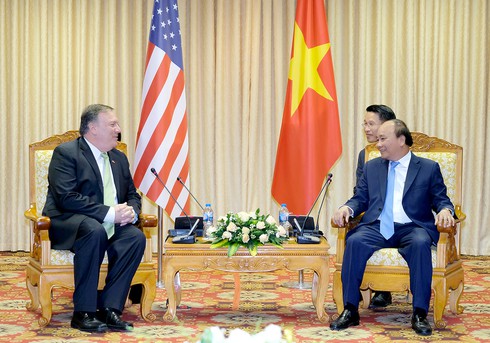 Ngoại trưởng Michael Pompeo bày tỏ vui mừng lần đầu được đến thăm Việt Nam và chuyển lời hỏi thăm của Tổng thống Donald Trump đến Thủ tướng Chính phủ Nguyễn Xuân Phúc. Ngoại trưởng Michael Pompeo khẳng định Hoa Kỳ coi trọng quan hệ Đối tác toàn diện với Việt Nam và cam kết sẽ tiếp tục thúc đẩy quan hệ này trong thời gian tới.Tại cuộc gặp, Thủ tướng Nguyễn Xuân Phúc chào mừng và đánh giá cao chuyến thăm của Ngoại trưởng Hoa Kỳ Michael Pompeo, khẳng định Việt Nam coi trọng quan hệ với Hoa Kỳ và mong muốn quan hệ Việt Nam-Hoa Kỳ tiếp tục phát triển thực chất, hiệu quả, đóng góp vào hòa bình, ổn định, hợp tác và phát triển ở khu vực và thế giới.