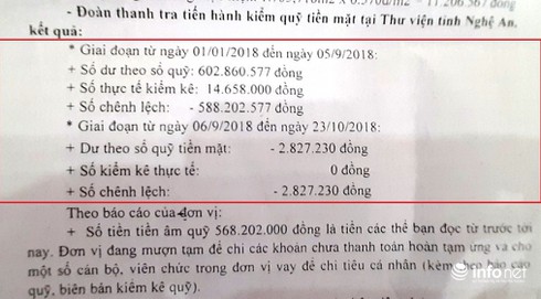 Cụ thể: Trong giai đoạn từ ngày 01/01/2018 đến ngày 5/9/2018, số dư theo sổ quỹ tại Thư viện tỉnh Nghệ An là: 602.860.577 đồng, tuy nhiên số thực tế kiểm kê chỉ còn là 14.658.000 đồng (bị âm 588.202.577 đồng).