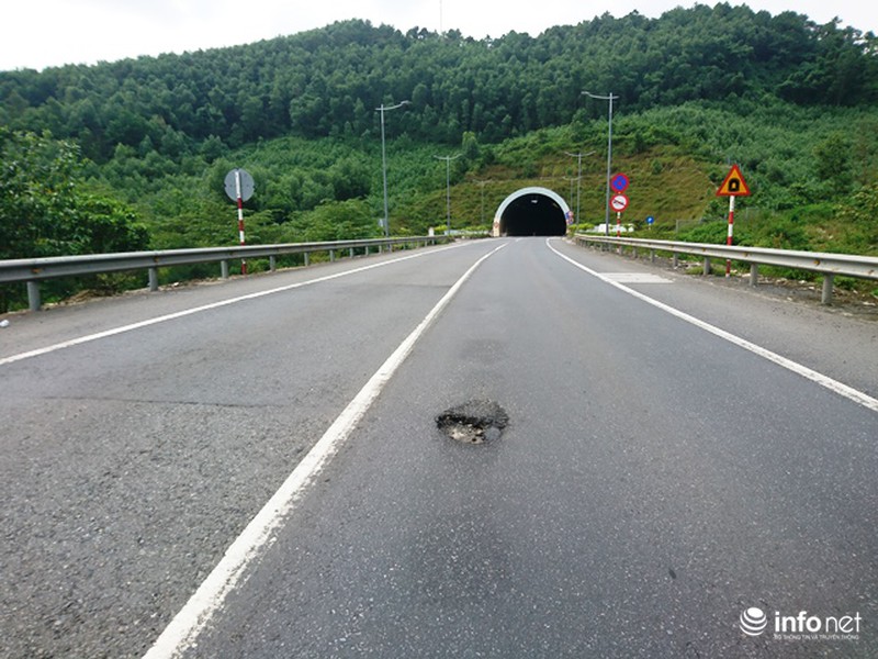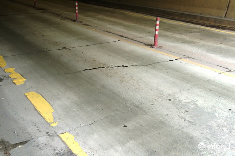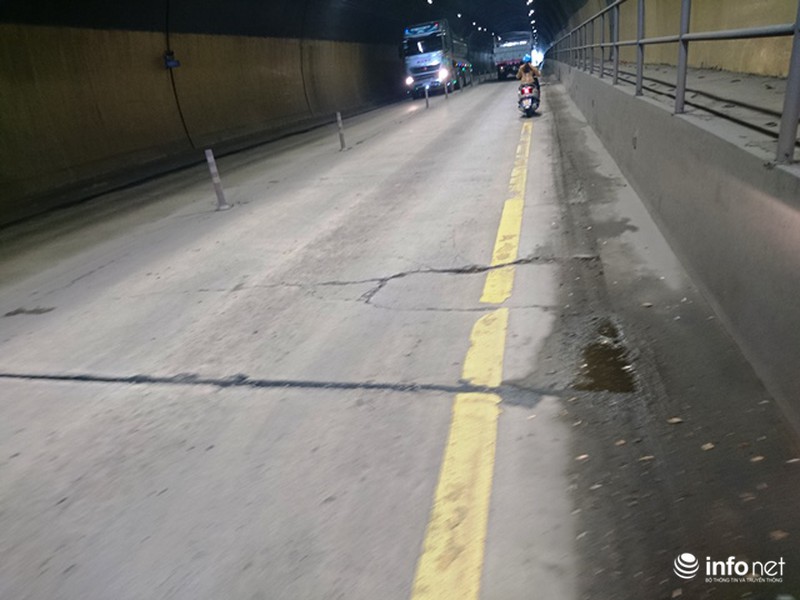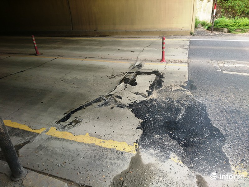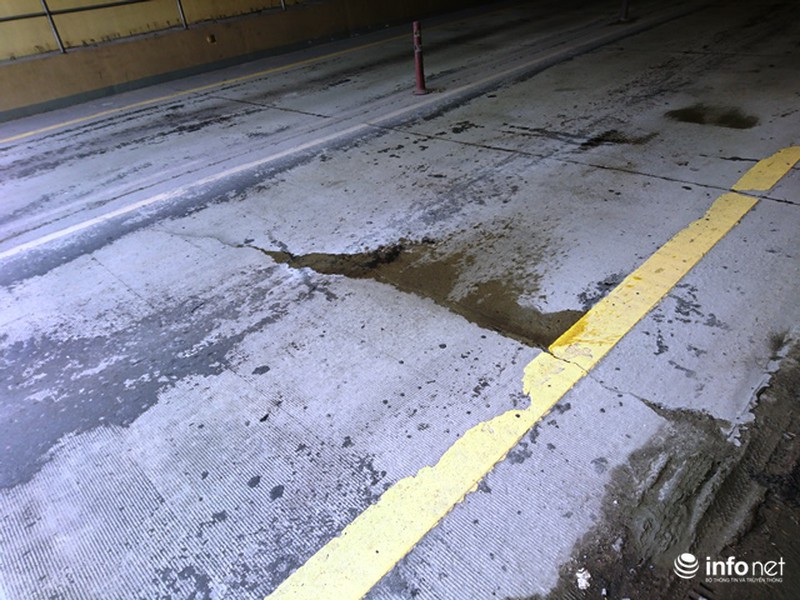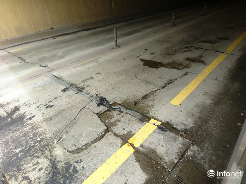 Cụ thể, tại đường dẫn vào Nam hầm Phú Gia xuất hiện các lỗ bong tróc trên mặt đường, hằn lún vệt bánh xe và nghiêm trọng là mặt đường trong hầm có các vết nứt kéo dài cắt ngang ở các miếng bê tông.