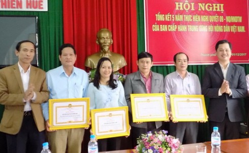 Đại diện lãnh đạo Hội ND tỉnh Thừa Thiên - Huế tặng bằng khen cho các cá nhân có thành tích xuất sắc trong công tác dạy nghề (ảnh: HNDVN). |