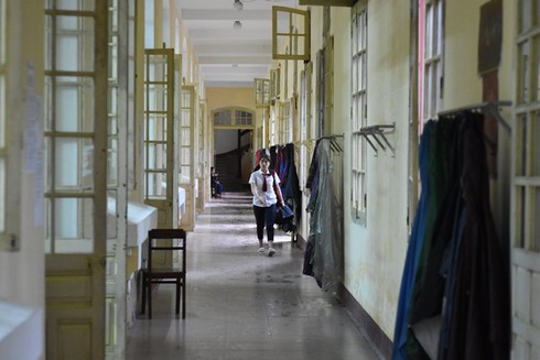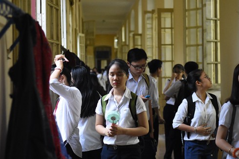 Hàng chục thí sinh tập trung tại hành lang Trường Quốc học Huế chờ vào làm thủ tục dự thi. |