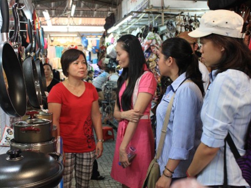 Đại sứ Hạnh Thúy thăm tiểu thương bán hàng Sunhouse ở nhà lồng chợ.