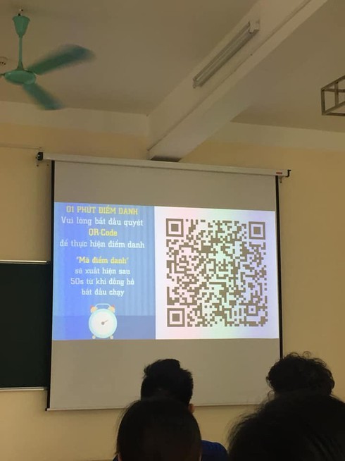 Theo đó, trên mạng xã hội chia sẻ sinh viên trong lớp sẽ dùng điện thoại quét mã QR được trình chiếu trên bảng.