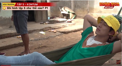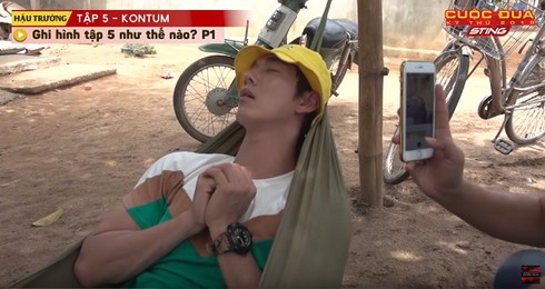 Cụ thể, khi mọi người xung quanh đang bận rộn với nhiệm vụ của mình thì Song Luân lại thong thả nằm võng... rồi ngủ quên với tư thế hài hước - hai tay chắp trước ngực như đang cầu nguyện.