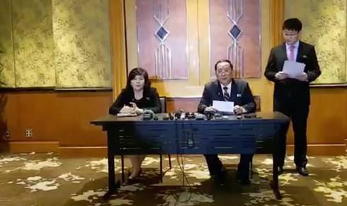Ngoại trưởng Ri Yong ho (người ngồi, cầm giấy) tại buổi họp báo. |