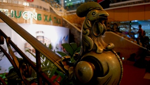 Trong ảnh là chú gà bằng đồng được đúc tại tay vịn cầu thang tầng trệt.