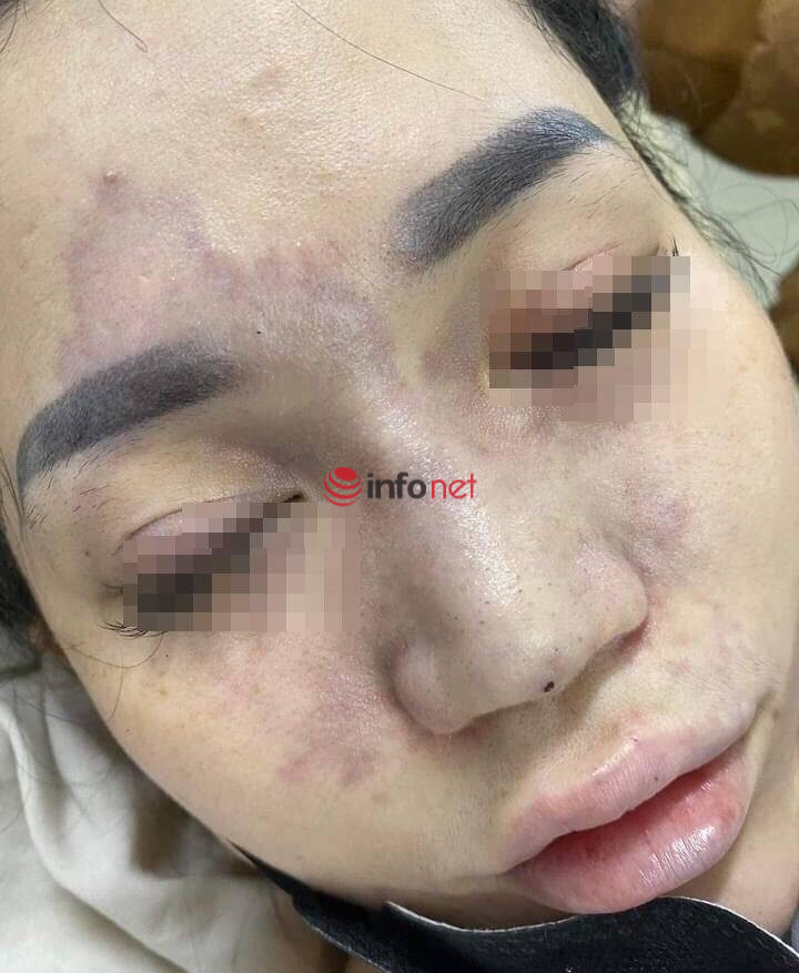 Tại đây chị được một nhân viên tên Tr. tiêm. Chỉ 5 phút sau tiêm, chị V bị sụp mí mắt, bầm tím lan rộng, đau nhức, không mở được mắt.