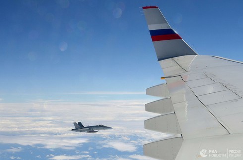 Máy bay chiến đấu F/A-18 Hornet của Không quân Thụy Sĩ hộ tống một máy bay chở khách của Nga. (Ảnh Ria Ngày 19/8/2019) |