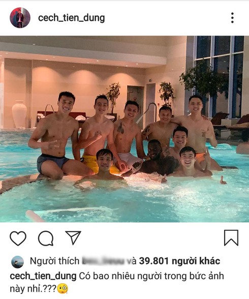 Mới đây, trên trang Instagram, thủ môn Bùi Tiến Dũng khiến các fan thích thú khi chia sẻ hình ảnh anh cùng dàn cầu thủ Quang Hải, Duy Mạnh, Trọng Hoàng,... chụp ảnh vui vẻ tại bẻ bơi. Anh chàng thủ môn hóm hỉnh chọc các fan: "Có bao nhiêu người trong bức ảnh này nhỉ?"