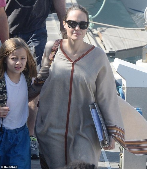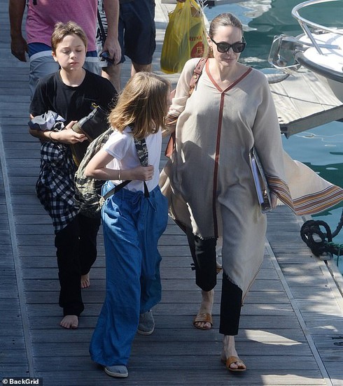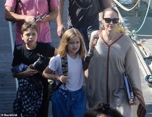 Nữ diễn viên 44 tuổi, xuất hiện tại đảo Fuerteventura ở ngoài khơi bờ biển Đại Tây Dương của châu Phi cùng cặp sinh đôi 11 tuổi Vivienne và Knox.