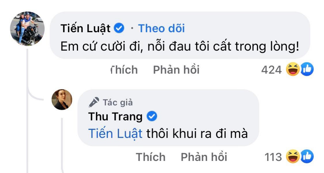 Dưới phần bình luận của bức ảnh, Tiến Luật chỉ đành “khóc ròng”: “Em cứ cười đi, nỗi đau tôi cất trong lòng!”. Trong khi đó Thu Trang còn nhân cơ hội trêu chọc thêm ông xã của mình.