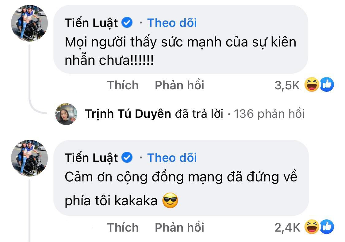 Dưới phần bình luận, người hâm mộ đã gửi lời chúc mừng đến Tiến Luật vì sau 6 năm mòn mỏi chờ đợi, cuối cùng, nam diễn viên cũng nhận được món quà như ý. Về phía Tiến Luật, anh cũng không giấu nổi sự hạnh phúc khi chia sẻ: “Mọi người thấy sức mạnh của sự kiên nhẫn chưa?”.