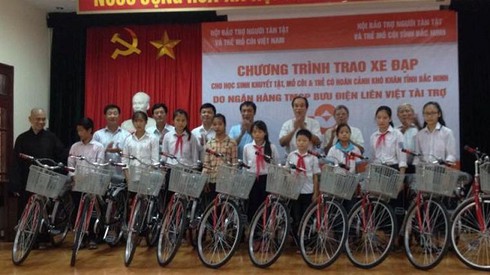 Đại diện Trung ương Hội Bảo trợ người tàn tật và trẻ mồ côi Việt Nam và Ngân hàng TMCP Bưu điện Liên Việt (Chi nhánh Bắc Ninh) trao xe đạp cho các em học sinh khuyết tật, con của các gia đình khuyết tật có hoàn cảnh khó khăn. |