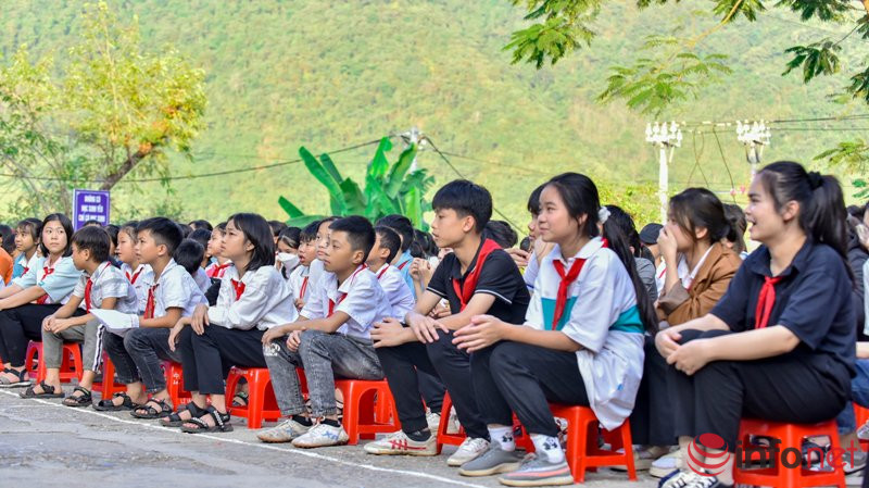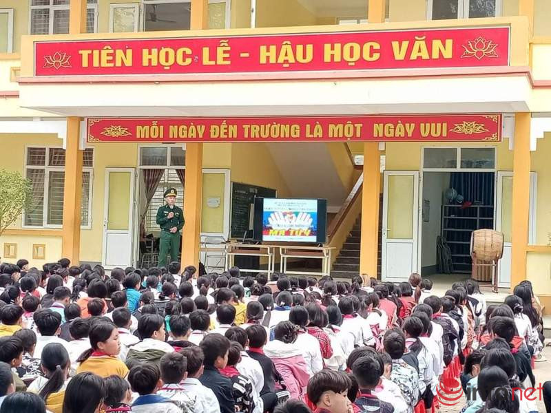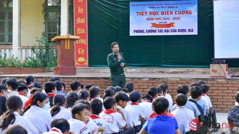 Chúng tôi có mặt tại Trường Tiểu học và THCS thị trấn Mường Lát để cùng hàng trăm em học sinh, các thầy cô giáo, cán bộ, chiến sỹ Biên phòng tham gia "Tiết học biên cương" với chủ đề về Luật phòng, chống tác hại của rượu bia do Đồn Biên phòng cửa khẩu Tén Tằn giảng dạy.