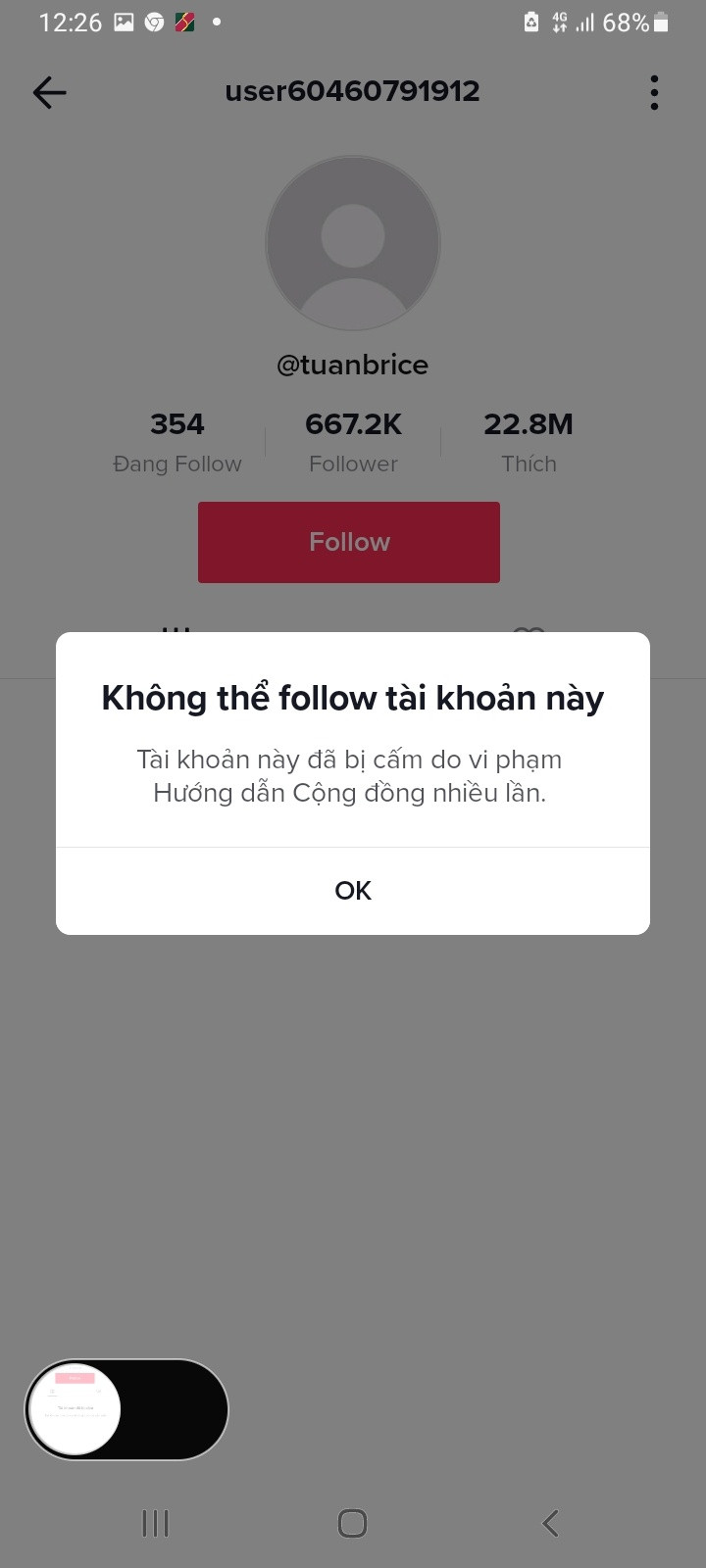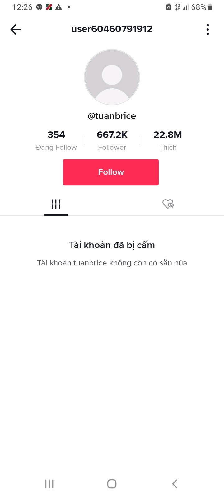 Sau khi bị dân mạng tẩy chay mạnh mẽ trên mạng xã hội, trưa 28/11, tài khoản TikTok Tuấn Brice (Nờ Ô Nô) hiện trạng thái bị khóa. Khi truy cập vào tài khoản này, người dùng nhận được dòng thông báo: “Tài khoản này đã bị cấm do vi phạm hướng dẫn cộng đồng nhiều lần”. Cư dân mạng cũng không thể follow tài khoản này nữa.