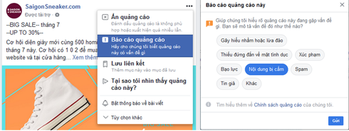 Khi gặp các dạng quảng cáo độc hại như quảng cáo hàng cấm, hàng giả, tiền giả, thông tin sai lệch… hay quảng cáo sử dụng tiếng lóng, nói lái để “lách luật”, người dùng nên báo cáo ngay đến Facebook để ngăn chặn các hành vi xấu trên mạng xã hội.