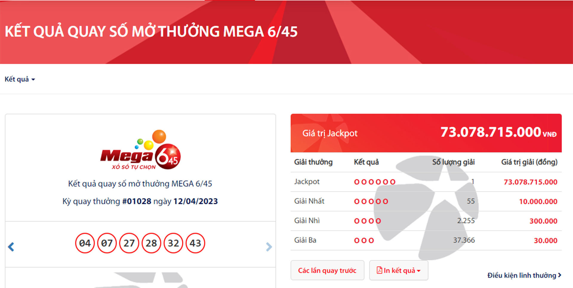Cũng trong kỳ quay lần thứ 1028 của sản phẩm Mega 6/45, ngoài giải Jackpot trị giá hơn 73 tỷ đồng, Vieltott còn tìm ra 55 giải nhất với mỗi giải trị giá 10 triệu đồng, 2.255 giải nhì mỗi giải trị giá 300.000 đồng và 37.366 giải ba với mỗi giải trị giá 30.000 đồng.