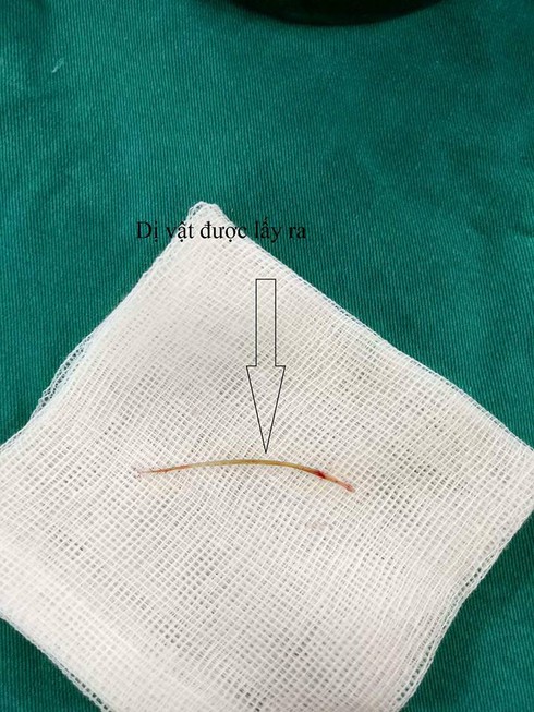 Sau 2 tiếng phẫu thuật, các bác sỹ đã xử trí tổn thương D3 tá tràng, làm sạch ổ áp xe, lấy được dị vật là một xương cá dài 4cm.