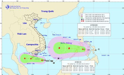 Dự báo trong 24 giờ tới, ATNĐ di chuyển theo hướng Tây Tây Bắc, mỗi giờ đi được khoảng 20km và có khả năng mạnh lên thành bão, khoảng chiều nay (01/11) bão sẽ đi vào biển Đông. Đến 04 giờ ngày 02/11, vị trí tâm bão ở vào khoảng 11,8 độ Vĩ Bắc; 117,0 độ Kinh Đông, trên khu vực phía Đông biển Đông cách đảo Song Tử Tây khoảng 300km về phía Đông. Sức gió mạnh nhất ở vùng gần tâm bão mạnh cấp 8 (60-75km/giờ), giật cấp 10.