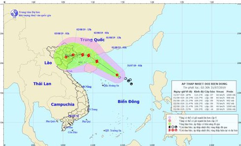 Bản tin áp thấp nhiệt đới mới nhất hôm nay của TT DBKTTV TƯ cho biết: Hồi 01h ngày 31/7, vị trí tâm áp thấp nhiệt đới ở vào khoảng 18,0 độ Vĩ Bắc; 114,1 độ Kinh Đông, cách quần đảo Hoàng Sa khoảng 230km về phía Đông Bắc. Sức gió mạnh nhất vùng gần tâm áp thấp nhiệt đới mạnh cấp 7 (50-60km/giờ), giật cấp 9. Bán kính gió mạnh cấp 6, giật cấp 8 trở lên khoảng 100km tính từ tâm áp thấp nhiệt đới.