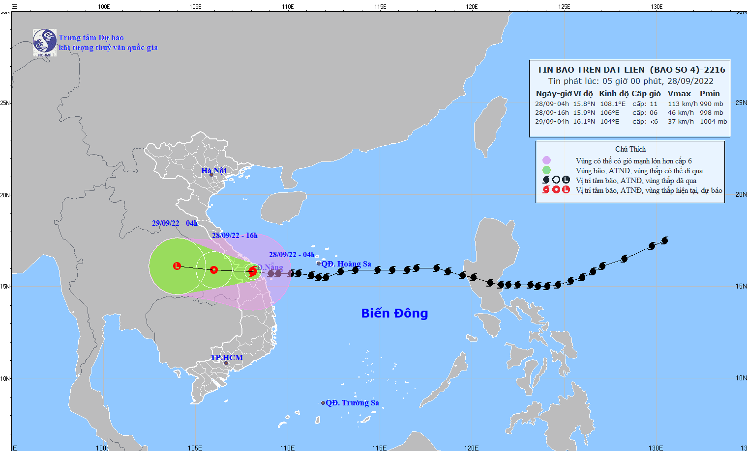 Theo Trung tâm dự báo khí tượng thủy văn Quốc gia, hồi 04 giờ ngày 28/9, vị trí tâm bão ở khoảng 15,8 độ Vĩ Bắc; 108,1 độ Kinh Đông, trên đất liền khu vực Thừa Thiên Huế-Quảng Ngãi. Sức gió mạnh nhất vùng gần tâm bão mạnh cấp 10-11 (89-117km/giờ), giật cấp 13. Bán kính gió mạnh từ cấp 6, giật từ cấp 8 trở lên khoảng 180km tính từ tâm bão; bán kính gió mạnh từ cấp 10, giật từ cấp 12 trở lên khoảng 50km tính từ tâm bão.