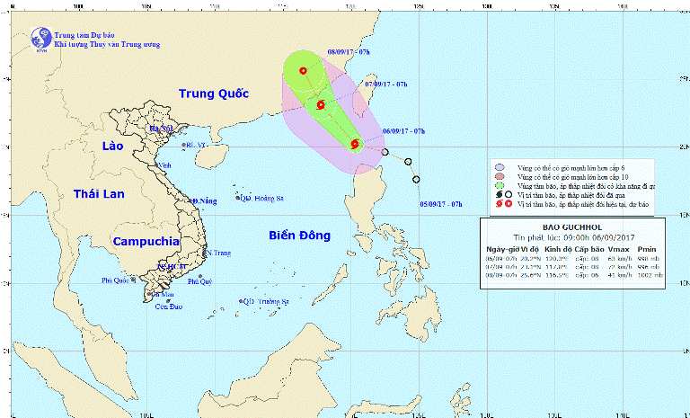 Dự báo trong 24 giờ tới, bão di chuyển theo hướng Tây Bắc, mỗi giờ đi được 15-20km. Đến 7 giờ ngày 7/09, vị trí tâm bão ở vào khoảng 23,1 độ Vĩ Bắc; 117,8 độ Kinh Đông, trên vùng biển phía Đông Nam tỉnh Phúc Kiến (Trung Quốc). Sức gió mạnh nhất ở vùng gần tâm bão mạnh cấp 8 (60-75km/giờ), giật cấp 10.